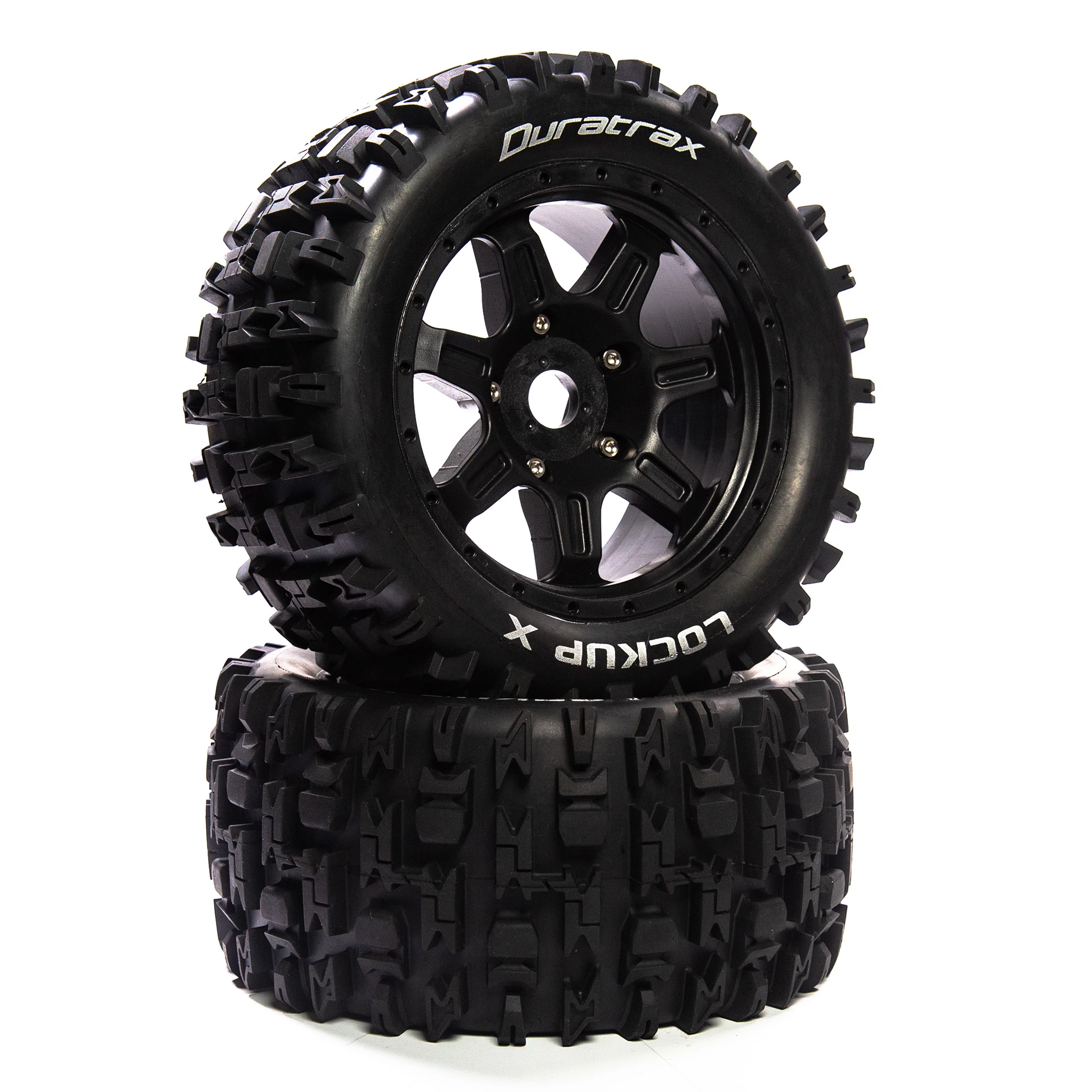 Duratrax offers these factory mounted 1/5 scale LOCKUP MT front/rear tires for the ARRMA KRATON 8S monster truck and ARRMA OUTCAST 8S stunt truck. They feature a tread pattern thatโs perfect for running on a wide range of surfaces: pavement, hard-packed wet or dry, loose-dry loamy, loose-wet mud and grass. Molded from a durable black composite plastic, the 24mm hex wheels measure 3.9 inches (98.2mm) wide and 8.4 inches (212.8) in diameter. The tires include one-piece foam inserts and are made from medium firm CS Sport compound. Sold in pairs.