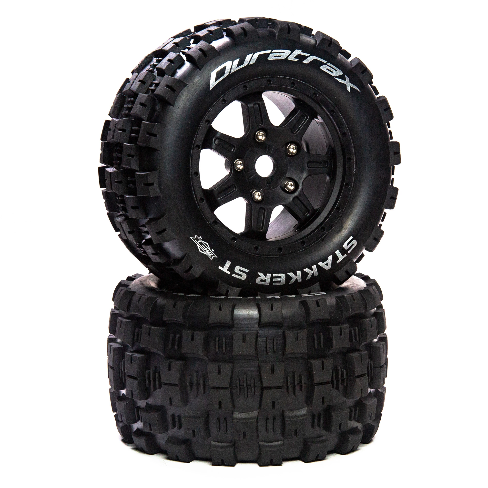 For running on pavement, loose dry loamy dirt, loose wet mud, hard-packed wet or dry grass Duratrax offers these factory mounted 1/8 scale STAKKER ST Belted front and rear tires for stadium trucks from ARRMA, HPI Racing and Traxxas. Molded from durable composite black plastic , the 17mm hex wheels measure 3.5 inches (88mm) wide and 6.3 inches (161mm) in diameter. The belted tires include one-piece foam inserts and are made from CS Sport Compound and are sold in pairs.